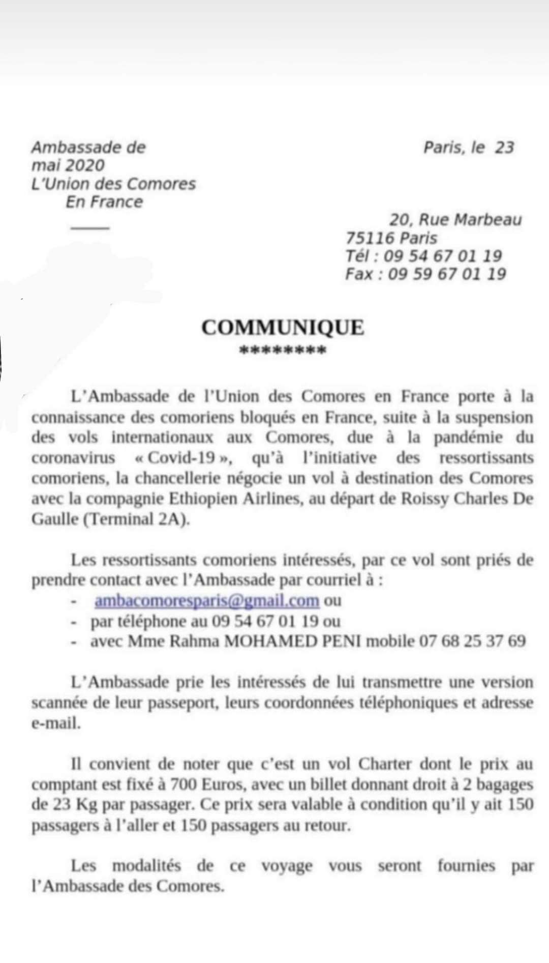 COVID19. Organisation d’un vol charter Paris – Moroni