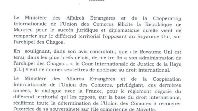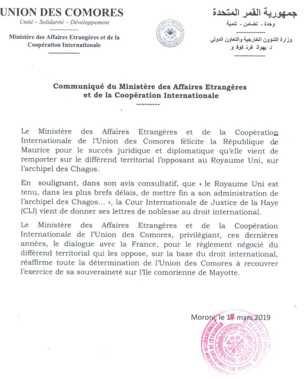Chiche Mr le ministre des affaires étrangers pourquoi vous ne portez pas cet affaires devant la CPI , l’ ile Maurice vient regler leur affaire une fois pour toute. Emboité lui le pat si vous avez assez de couilles sur votre pantalon , apportez le devant la CPI. Votre marchandage de faire de Mayotte votre fond de commerce finira une bonne fois pour toute . Toute la communauté internationale a compris que vous regrettez votre choix puisque pendant ces années écroulées vous avez hautement brillé de votre incapacité et de votre incompétence voire de vote médiocricité de sortir votre pays dans le gouffres et d’ une manière déguisé vous voulez que la France retourne au Comores sans le dire ouvertement donc vous vous servez de Mayotte pour vous ridiculiser. Sachez que c’est irréversible les Anjouanais l’ avait exprimés ouvertement en 1996 avec des Bandéroles écrits Noirs sur Blancs que » les Mahorais avaient raison de choisir de rester avec la France . Pour vous rafraichir la mémoire Mr le ministre envoyer moi votre adresse mail , je vous enverrais les images et la vidéo de la revolte des Anjouanais ne voulant plus rester dans cette union mensongère et qui restera toujours DISCRIMINATOIRE entre les iles souq la domination des WANGASIDZAS ma vantaras kawana hindrou habillé en costumes cravates avec une malette remplie des diplomes falcifiés et des passeports et Etat civil détournés ou volés . Le pire de ce peuple c’est d’ avoir meme vendu sa propre citoyenneté à des terroristes. LA ILLAH HA ILLAH LOIHOU .Il ne manquait plus que ça .
