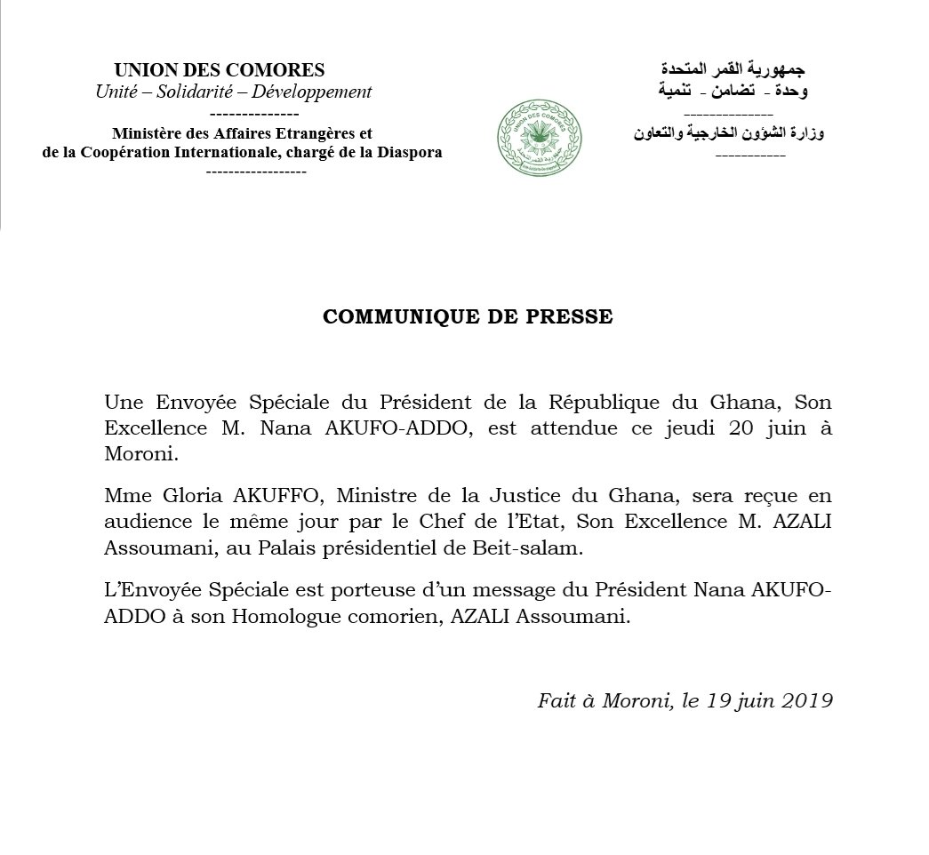 Une Envoyée Spéciale du Président de la République du Ghana, Son Excellence M. Nana AKUFO-ADDO, est attendue ce jeudi 20 juin à Moroni.