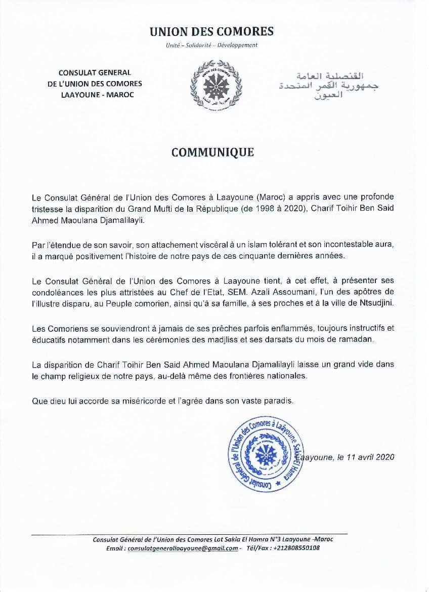 Communiqué du consulat général des Comores à Lâayoune au Maroc suite au décès du mufti Fundi Toihir.