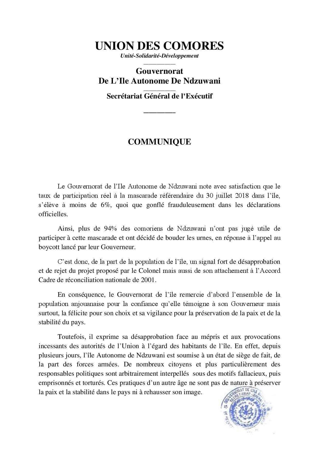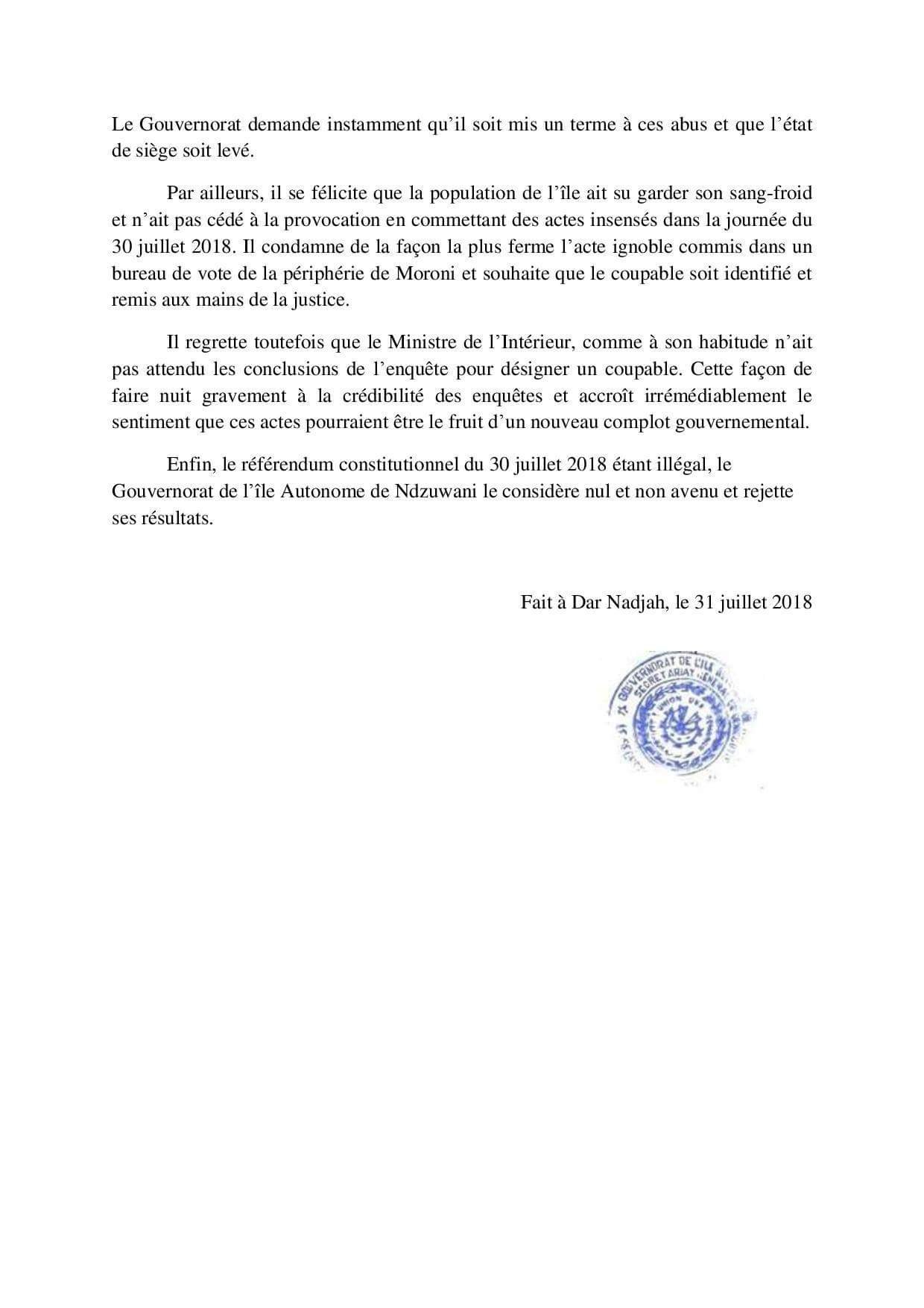 Enfin, le référendum constitutionnel du 30 juillet 2018 étant illégal, le Gouvernorat de l’île Autonome de Ndzuwani le considère nul et non avenu et rejette ses résultats.