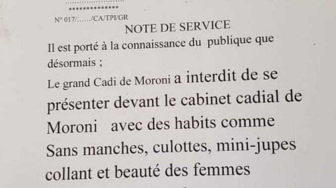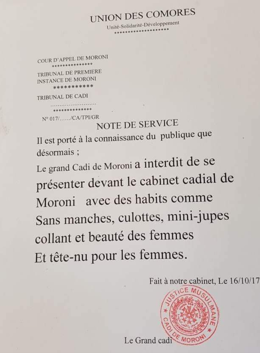 Dans une note de service du tribunal de Moroni, le bureau du Cadi informe qu’il est désormais interdit aux femmes de :