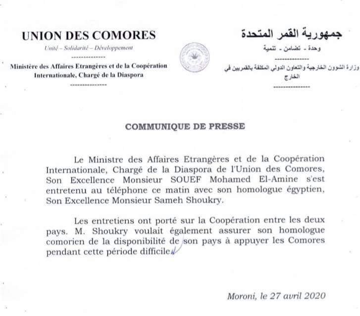 Communiqué de presse du Ministère des Affaires Étrangères et de la Coopération Internationale, Chargé de la Diaspora: