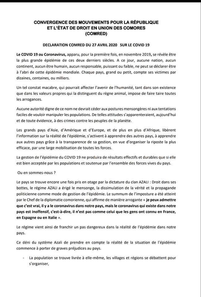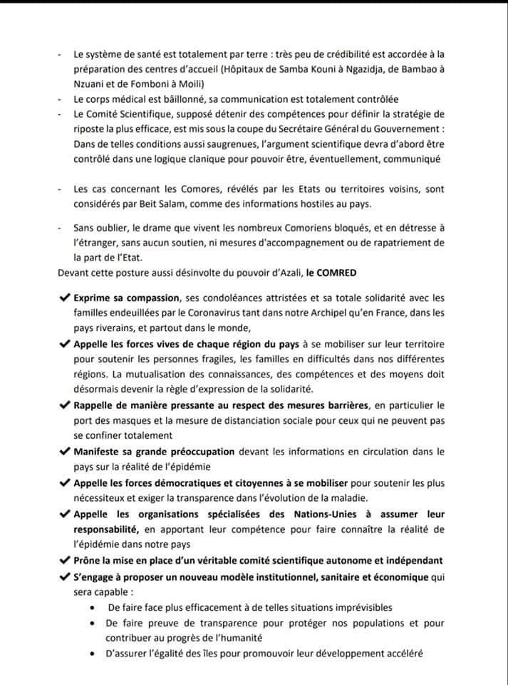 Le COMRED est une alliance politique qui unit les organisations suivantes : Ndzuwani En Marche (NEM), M17 de Mwali, Dawula ya Haki , Mouroua, Dr Karihila, Des Notables de Ngazidja et PCDP Dja Mnazi :