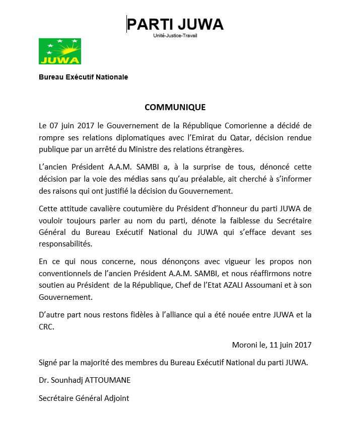 Dans un communiqué du parti Juwa signé par le Secrétaire général du parti le Dr Sounhadji Attoumane, il condamne les propos tenus par Abdallah Ahmed Sambi.