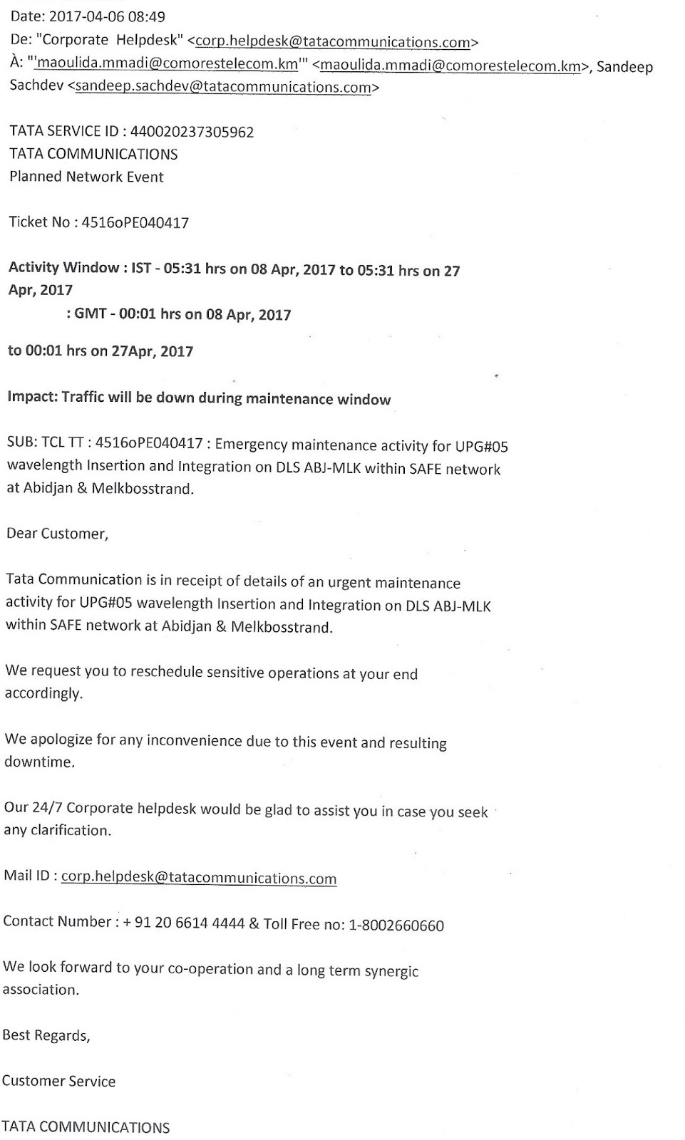 L’Union des Comores sera privée d’internet du 08 avril 2017 au 27 avril 2017. C’est une information tirée d’un email envoyé à la Société Comores Telecom. Rien n’a été confirmé par le directeur de Comores Telecom.