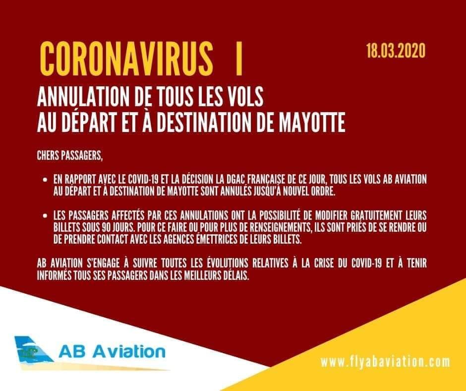 La compagnie AB aviation annule tous ses vols au départ et à destination de Mayotte à cause de la présence de Coronavirus. Actuellement Mayotte compte 4 cas de coronavirus.