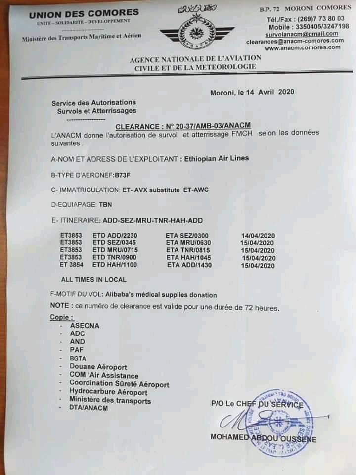 L’avion partira d’Addis Abeba et débarquera les dons à Seychelles, Maurice et Antananarivo avant de toucher Moroni.