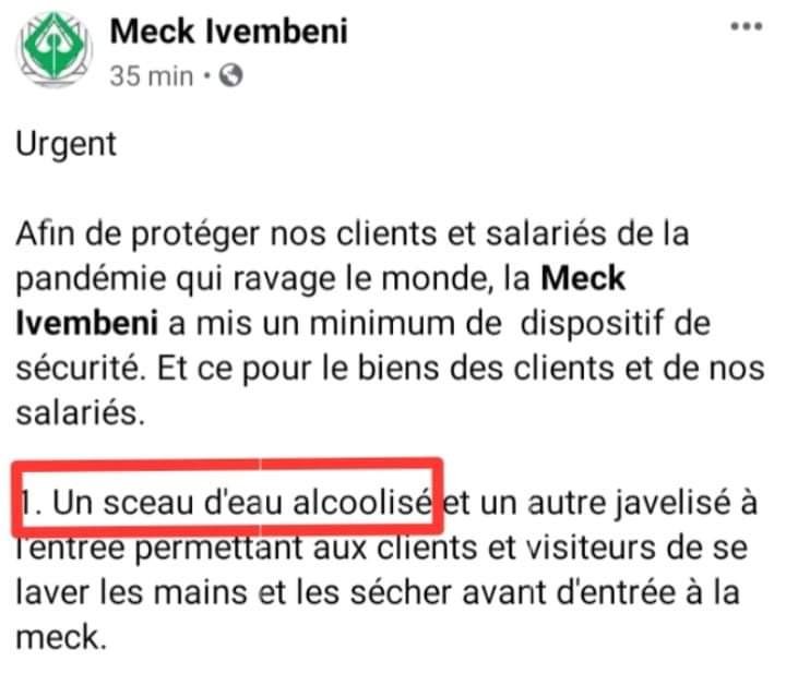 Les clients de la banque Meck-Ivembeni auront de l’eau alcoolisée pour laver les mains. Certains vont peut-être profiter pour boire et se saouler…
