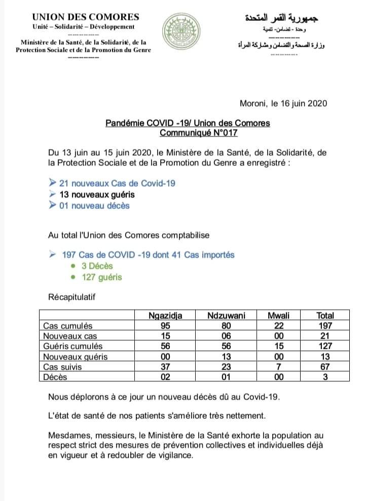 Le coronavirus continue sa progression aux Comores. 21 nouveaux cas de Covid-19 selon le ministère de la santé soit un total de 197.