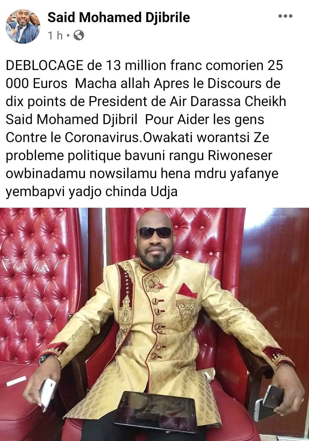Foundhi Djibril aurait débloqué 25 000 euros pour la prévention contre le coronavirus aux Comores. Aucun cas de coronavirus n’a été détecté aux Comores et il n’existe pas de laboratoire capable de faire l’analyse du coronavirus aux Comores.