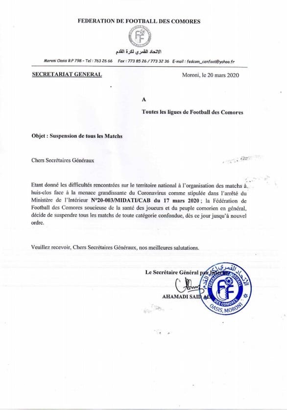 Alors que le ministère de l’intérieur avait décidé de faire jour les matches en huis clos dans le cadre des mesures de prévention contre le coronavirus, la Fédération de football a décidé d’aller encore un peu plus loin en suspendant carrément toutes les compétitions relevant de ses prérogatives et ce jusqu’à nouvel ordre. Voir document ci-dessous👇