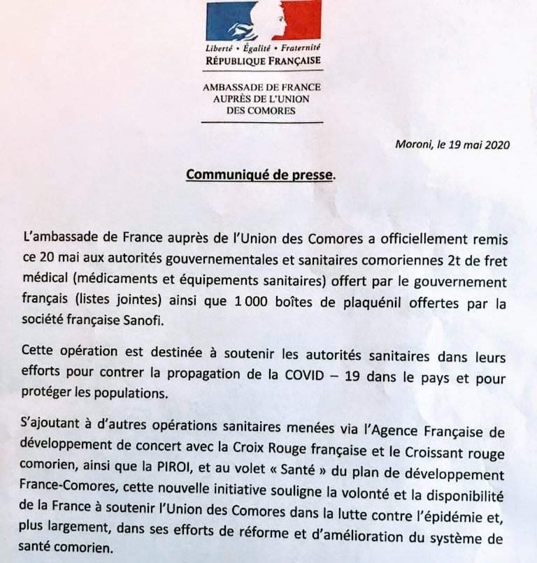 Dans le cadre de la lutte contre le Covid-19 aux Comores, l’ambassade de France a offert de 2 containers de médicaments aux autorités comoriennes.