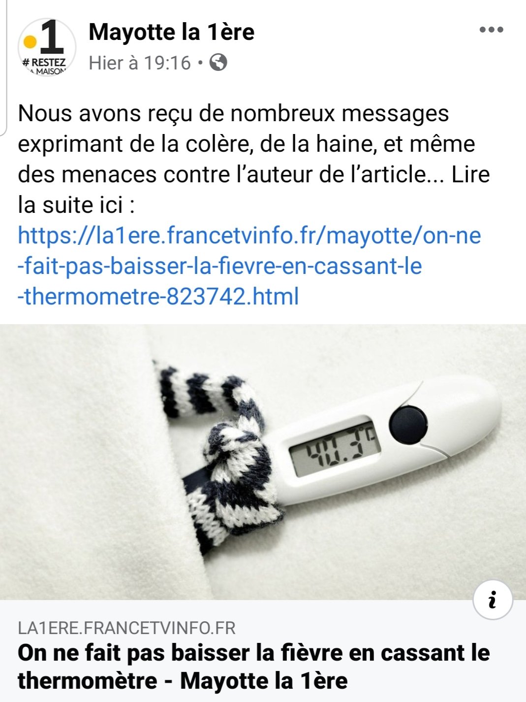 Après les révélations faites par nos confrères de Mayotte 1ère, plusieurs internautes Comoriens ont menacé le journaliste comme ils ont l’habitude de le faire avec Comores infos. Le journaliste a juste fait son travail. Si l’information était fausse ça serait au gouvernement d’Azali de porter plainte. Mais il ne portera jamais plainte car des résultats scientifiques ont prouvé ce que le journaliste a écrit.