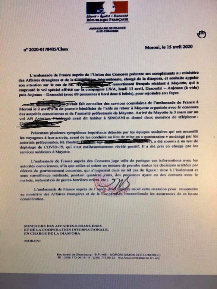 Les informations sur le patient testé positif Covid-19 viennent d’être confirmées par l’ambassade de France aux Comores. Voici quelques informations émanant de l’ambassade de France à Moroni sur le patient testé positif au Covid 19, en provenance de Moroni et à destination de Mayotte. Un communiqué rendu public par la journaliste Faïza Youssouf.