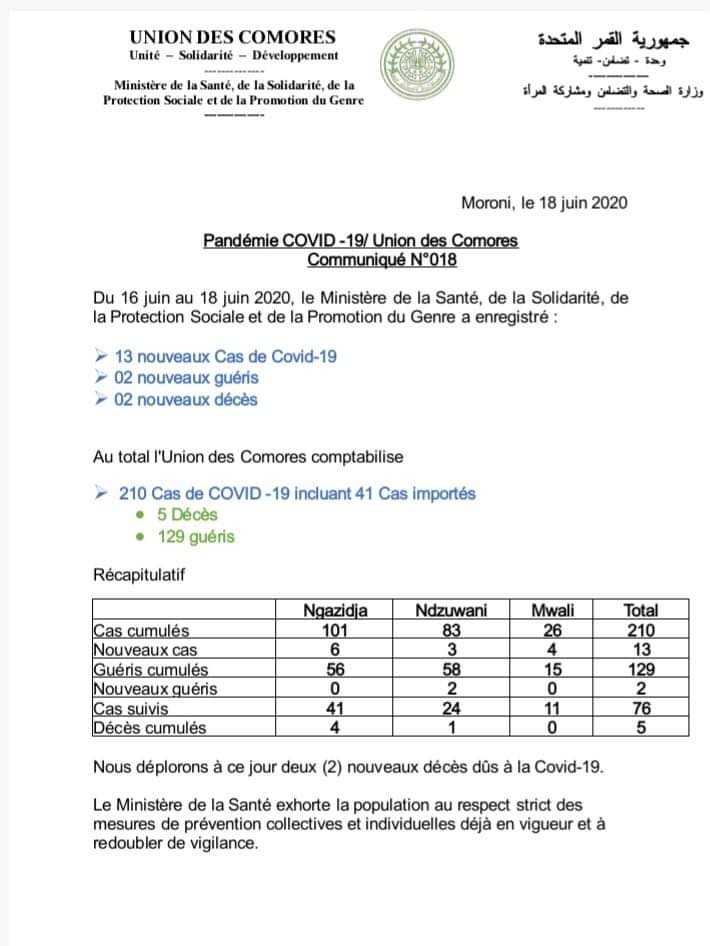 D’après le dernier point de situation du ministère de la santé, les Comores comptabilisent 210 cas confirmés de