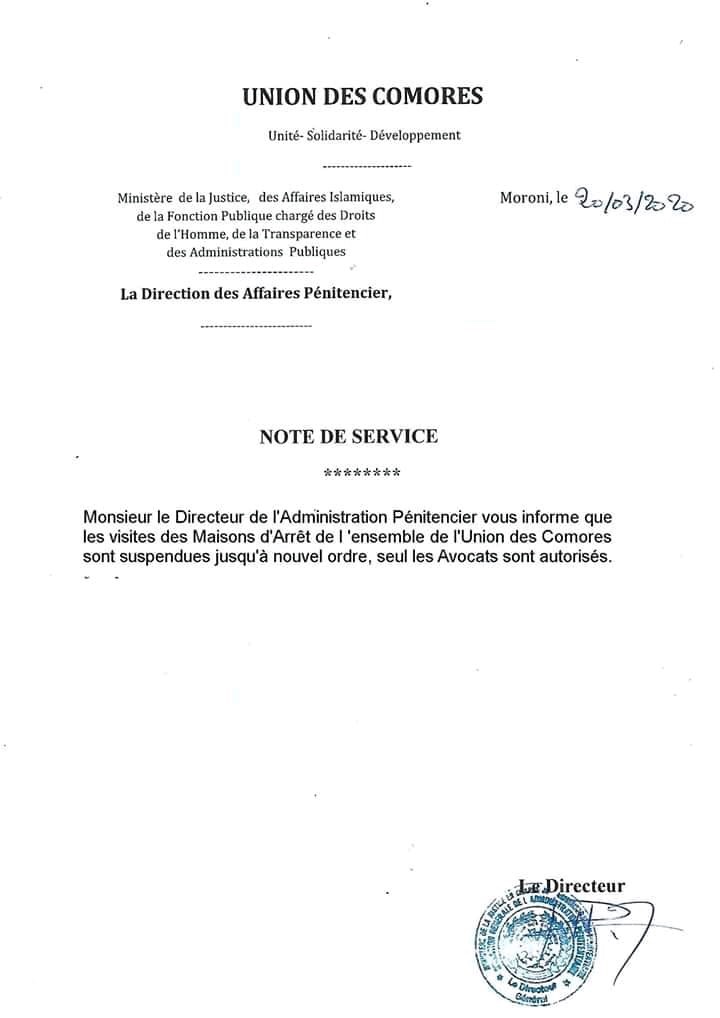 Pour protéger la population carcérale contre la pandémie de coronavirus, la direction des affaires pénitentiaires a pris une mesure suspendant jusqu’à nouvel ordre les visites en prison sur l’ensemble du territoire national. Voir document ci-dessous 👇.