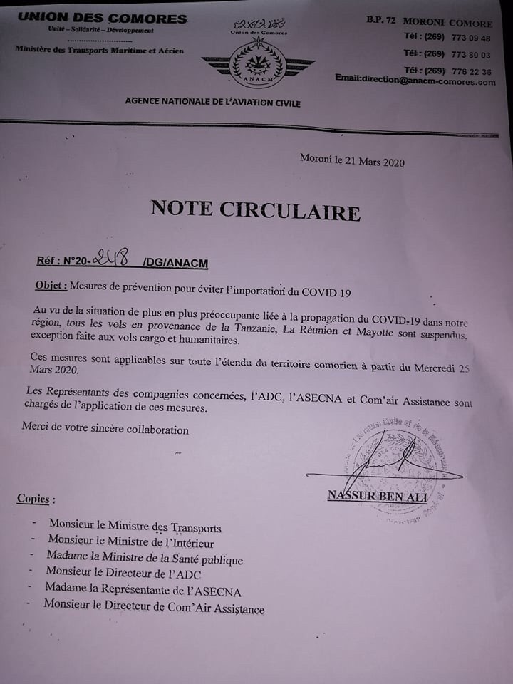 L’avion civile comorienne monte à 12 le nombre de pays ou territoires interdits de ramener des passagers à Moroni. Le dernière décision de ce samedi concerne Mayotte, La Réunion et la Tanzanie. Trois territoires qui viennent de se rajouter aux 9 neuf autres de la veille. Toutefois, cette dernière mesure entrera en vigueur dès le 25 mars prochain. Retrouver ci-contre les deux listes👇