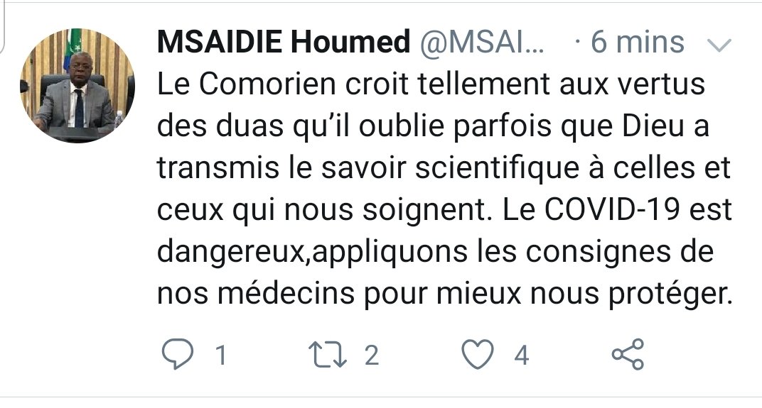 Le ministre de l’économie Houmed Msaidié lance un appel sur Twitter. « La population doit suivre les consignes des médecins ».