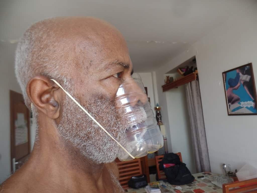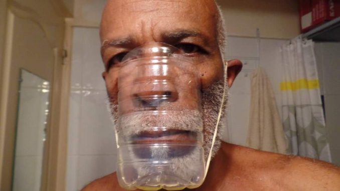 Insolite. Abdoulbar lance un nouveau type de masque anti coronavirus. Le masque permet également de retenir la bave et les crachats… Le confinement vient de faire sa première victime… Le masque artisanal est fait avec une bouteille en plastique. L’histoire ne dit pas s’il a déposé son invention🤣🤣🤣
