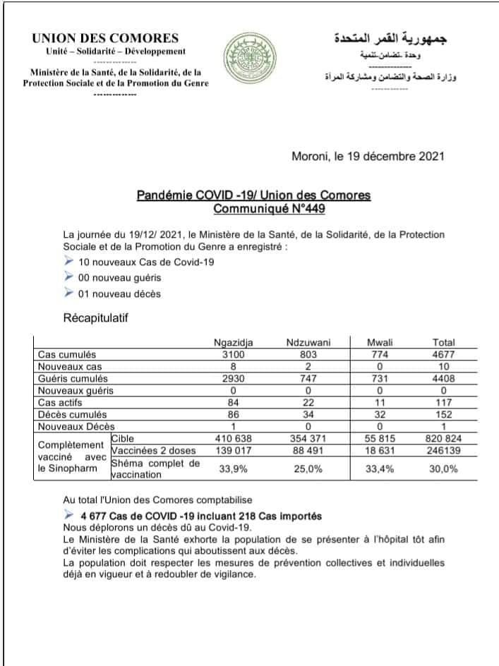 Communiqué du Ministère de la Santé du 19 décembre 2021. 10 nouveaux cas, 1 nouveau décès, 117 cas actifs.
