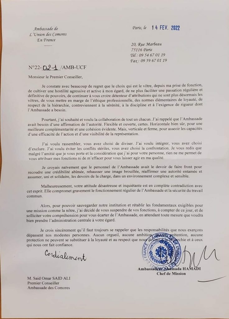 Vous devez vous souvenir de ce courrier de l’ambassadeur des Comores à Paris, qui avait pris sa plus belle plume pour annoncer à M. Said Omar SAID ALI, sa suspension de son poste de Premier Conseiller à l’Ambassade.