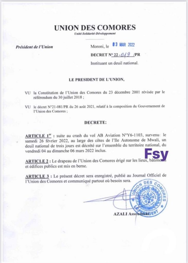 Crash Ab Aviation : Azali décrète un deuil de 3 jours