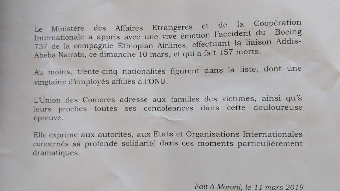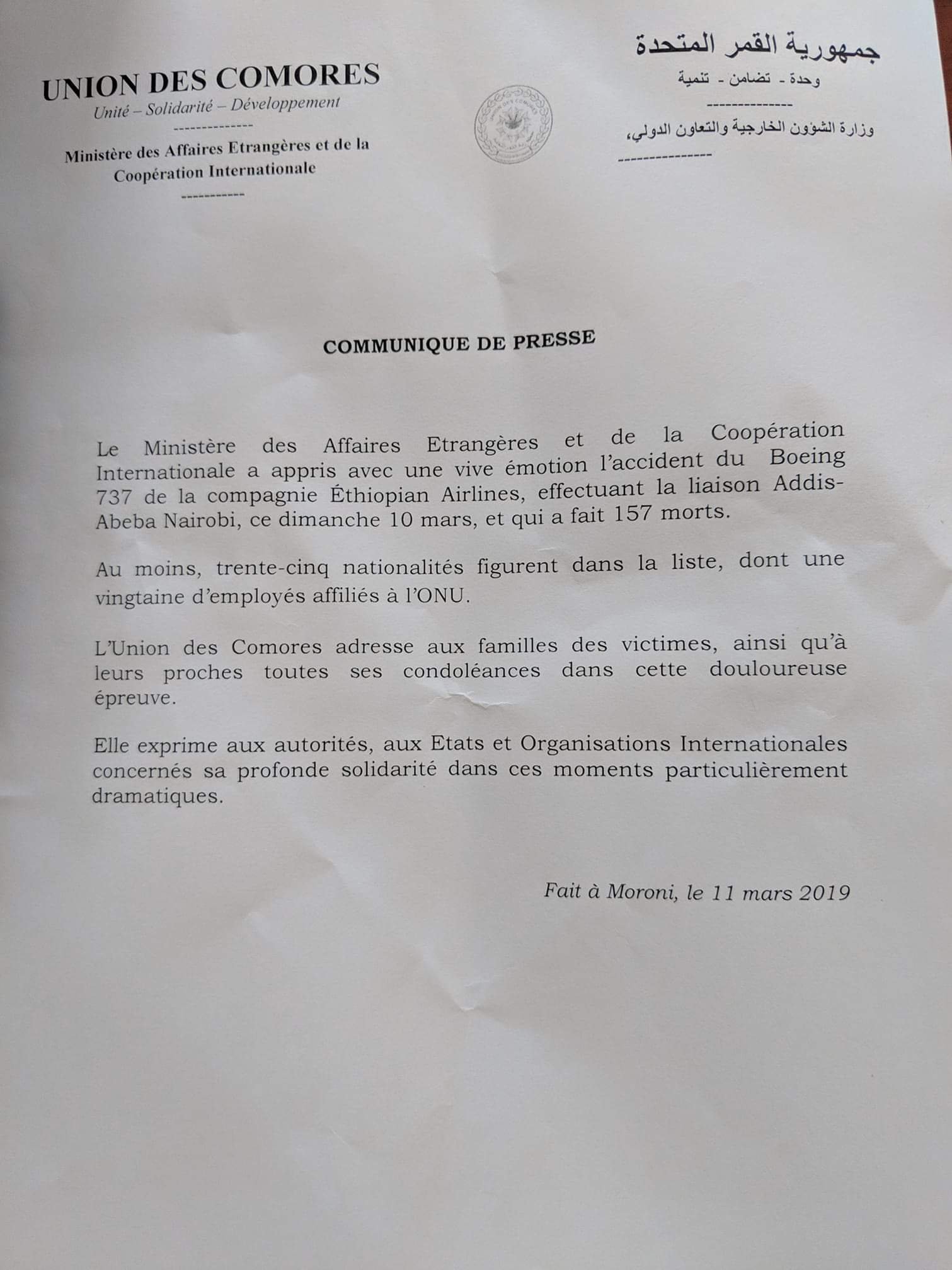Crash Éthiopian : communiqué du ministère des affaires étrangères