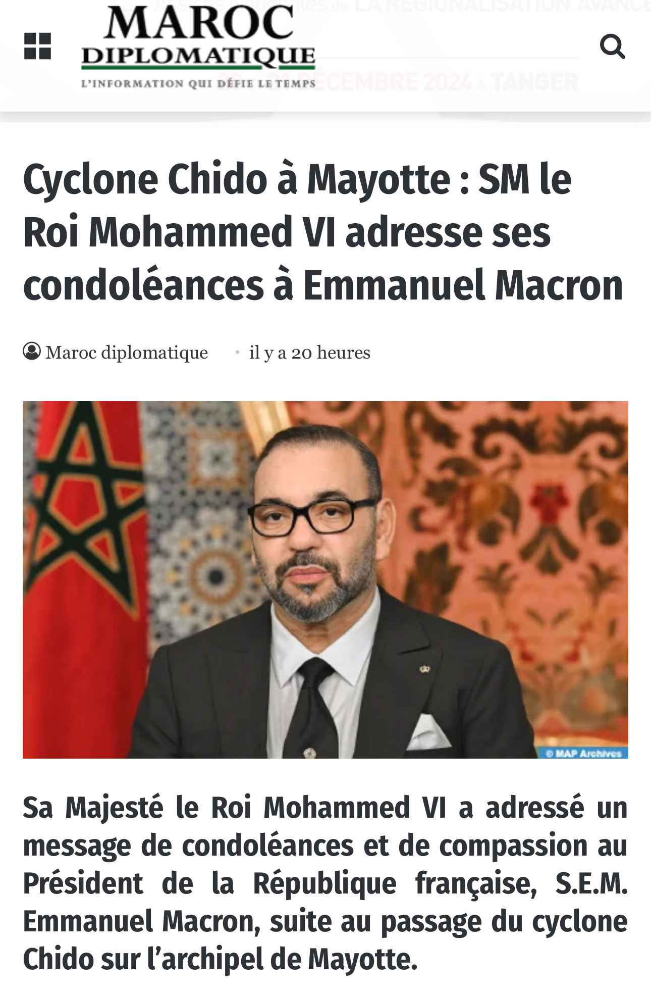 Le passage du cyclone Chido, qui a frappé l’archipel de Mayotte avec une violence inouïe, causant de lourdes pertes humaines et matérielles, a mis en lumière une attitude inattendue et controversée du Maroc envers un pays pourtant allié, l’Union des Comores. Alors que les Comores continuent de revendiquer Mayotte comme partie intégrante de leur territoire, le roi Mohammed VI a choisi d’exprimer ses condoléances à la France, ignorant totalement les Comores, pourtant directement affectées par cette tragédie.