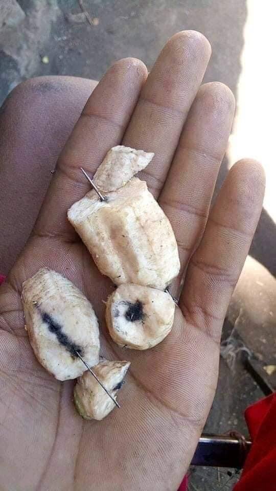C’est un acheteur qui en epluchant des bananes vertes trouva des aiguilles enfoncées dans la banane. C’est un système antivol trouvé par les planteurs pour protéger les bananiers contre le vol fréquent des régimes de bananes. Seulement, les voleurs de ces bananes ne les mangent pas pour la plupart des cas. Ils les vendent. Donc il reviendra à un innocent, qui peut être aussi un proche de l’auteur de ce dangereux système antivol, d’avaler ces aiguilles.