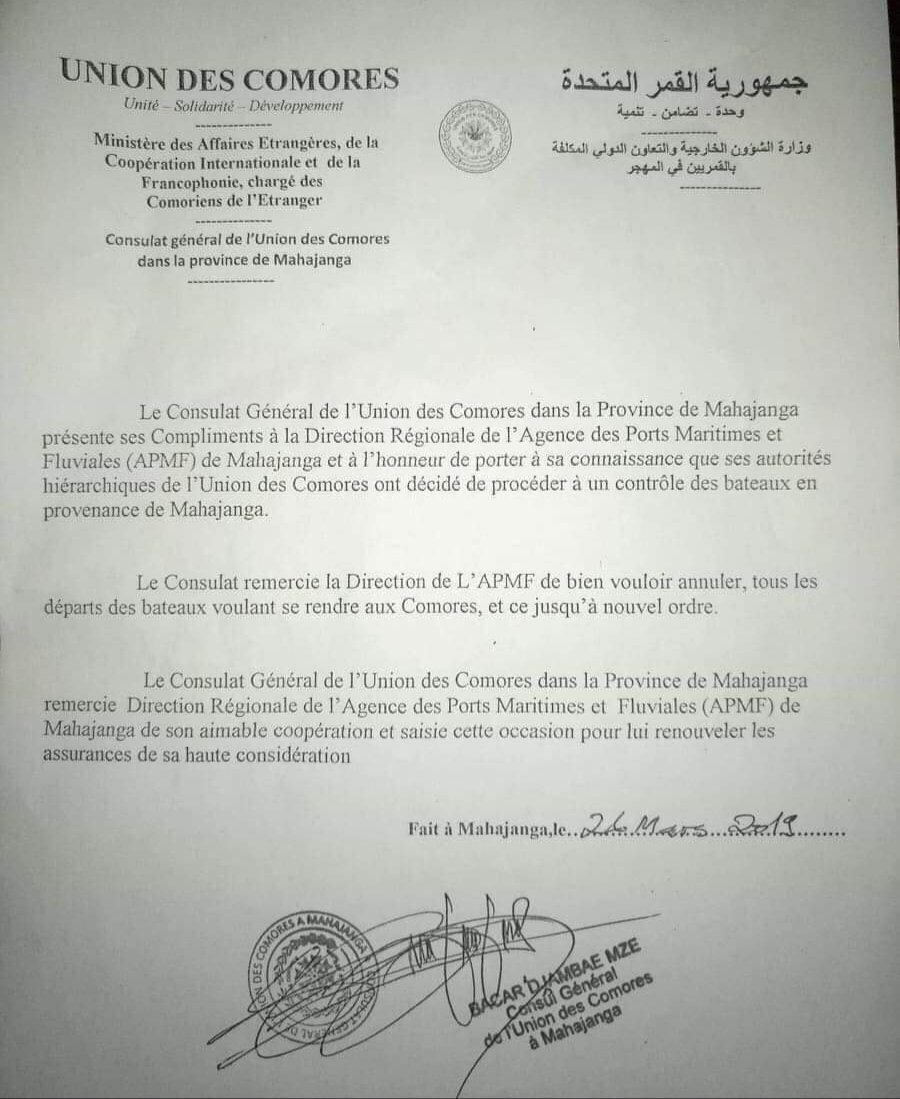 Le gouvernement vient de prendre une décision lourde de sens. Il a suspendu l’arrivée des bateaux en provenance de Madagascar. Une décision motivée par la peur de voir débarquer des caisses d’armes et des mercenaires. La paranoïa gagne du terrain.