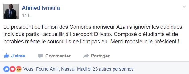 Il faudrait,à mon sens, que le geste inapproprié, disproportionné irresponsable de la part du chef de l’Etat serve de leçons à tout et à toute citoyen et citoyenne comorien(comorienne).Mais ce qui est archi-regrettable mes chers compatriotes, nous les jeunes, les moyens jeunes, sommes tous impliqués et embrigadés dans leur système politique archaïque des années postcoloniales alors que le temps de sursaut a sonné, nous devons nous démarquer de tel comportement dinosordique pour associer notre pays à la modernisation, en l’occurrence, le développement économique, social, culturel…par le biais d’instauration des grandes réformes soutenues et avancées pour sortir notre cher pays de l’ornière. EN 1998,le Président Taki, paix à son âme, invité par son homologue malgache à prendre part à la fête de l’indépendance,s’est accordé le temps de venir nous serrer la main à l’aéroport d’Ivato et par la suite,il a accepté nous rencontrer à son hôtel hulton de Tana(nous les étudiants de l’époque).Ne croyez pas que tout le monde est bon patriotique. Un patriotique c’est celui qui a l’amour des siens. Notre cher pays manque encore de ça helas! C’est ainsi que le parti MDA que j’ai l’honneur de diriger propose la métamorphose, un changement qui ne laissera aucune empreinte du passé en vue de redresser notre pays.salim