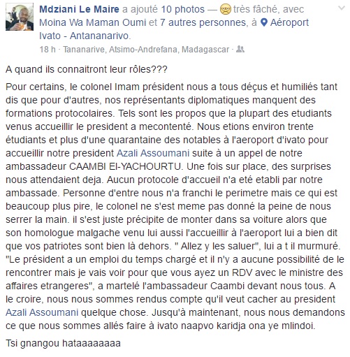 Bonjour, c’est déplorable, voire même triste que l’avenir de demain (les étudiants) n’est pas considéré. Mais, je crois qu’il faut faire le distingo entre le travail des représentants diplomatiques au chef duquel l’ambassadeur de Comores à Mada qui devrait savoir qu’il y aurait un accueil étudiant donc l’intégrer dans l’agenda du président pour qu’il puisse en tenir compte et le président qui lui suit texto ce que le protocole a préétabli. Je ne suis pas ici entrain de jouer l’avocat de qui que ce soit. Seulement je pense qu’un président respecte un service protocolaire prédéfini avant son arrivé.