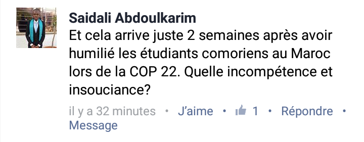 La jeunesse dans un Pays, c’est sacrée car c’est l’avenir, c’est l’espoir et c’est la colonne vertébrale de tout un peuple. Vous monsieur qui défendez le président, quelque soit les circonstances ou le contexte dans lequel on se trouve, un chef d’Etat à l’étranger, après avoir été accueilli par son homologue, va à la rencontre de des ses ressortissants et c’est protocolaire. Soyons convaincu que nos politiques n’ont l’habitude d’aller vers les comoriens que s’il y a des votes. N’oublions pas que récemment l’article 3 de la CEDH a été violé par le peuple français de Mayotte en traitant les ressortissants comoriens de manière inhumaine, dégradante, cruelle…Qu’a fait l’Etat comorien Qui aurait invoqué son droit de revendication internationale auprès de la cour européenne de droit de l’homme et auprès de la C.I.J pour réparation de préjudice subi. Quelque soit leur situation sur le territoire, ils ont droit au respect de leur dignité…C’est donc pour vous dire que les politiques comoriens jusqu’à preuve de contraire, s’en foutent catégoriquement.Ils sont toujours arrogants, hautains en considérant cette manière d’être qui est la leur est représentative par rapport à une haute responsabilité politique. A Mada, ce geste a prêté l’attention du Président malgache sur un tel comportement inapproprié de la part de son homologue comorien. Ceci se traduit par l’amateurisme. salim