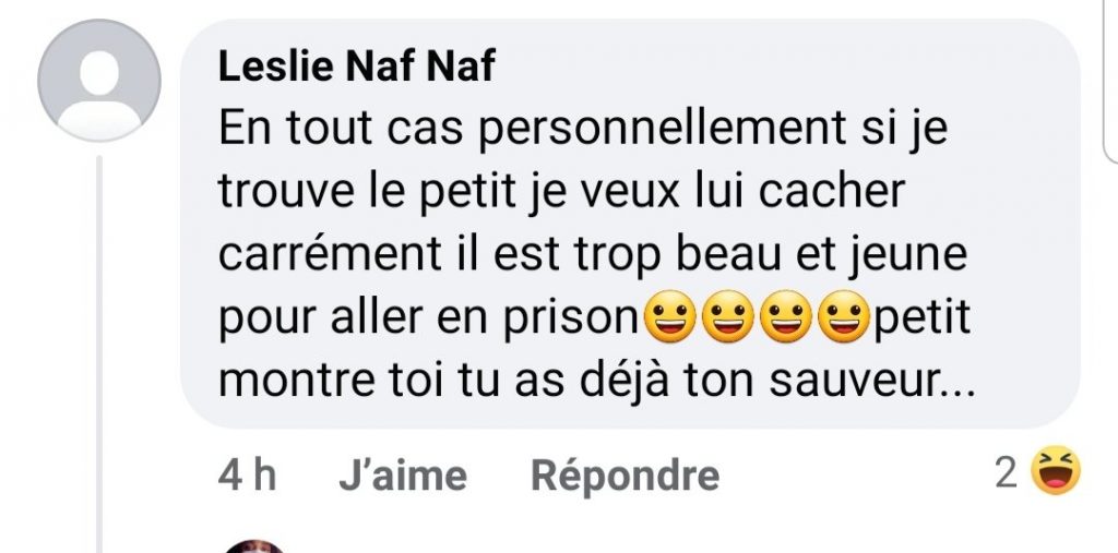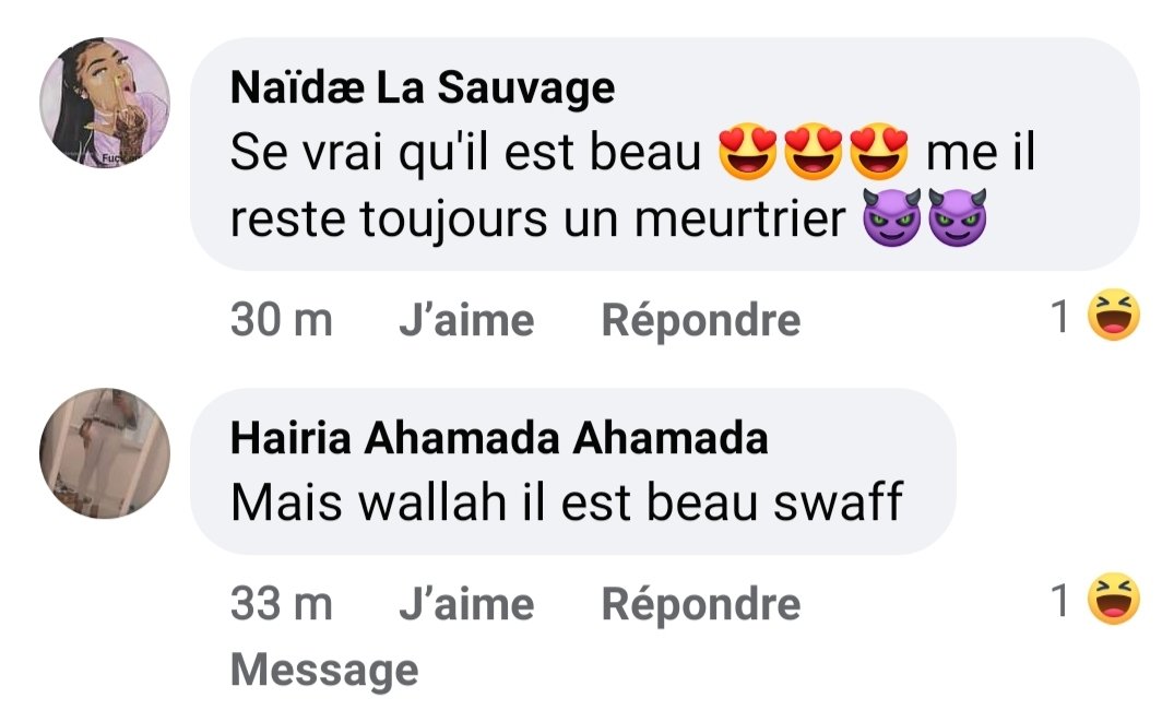 Philippe Hervé âgé de 17 ans est activement recherché pour le meurtre de Hassane Ouled. Des jeunes filles ont craqué sur la beauté du jeune homme et ne croient pas qu’il puisse être le meurtrier tellement il est beau selon les jeunes femmes. Ci dessous les commentaires :