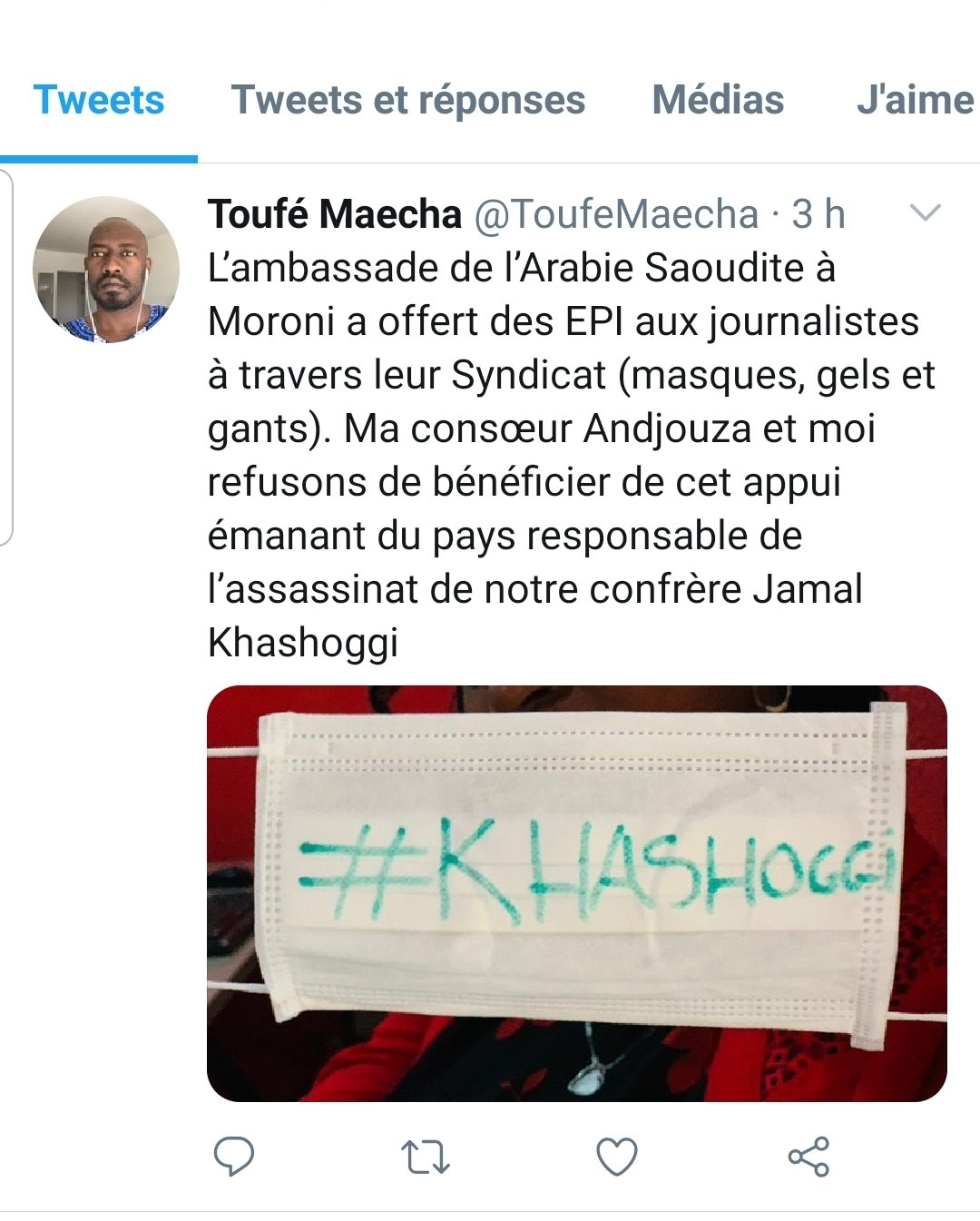En la mémoire du journaliste khashonggi assassiné par l’Arabie Saoudite, certains journalistes ont refusé ces matériels : « Ma consœur Andjouza et moi refusons de bénéficier de cet appui émanant du pays responsable de l’assassinat de notre confrère Jamal Khashoggi », a écrit sur le réseau Twitter Toufé Maecha, secrétaire de rédaction du quotidien La gazette des Comores.