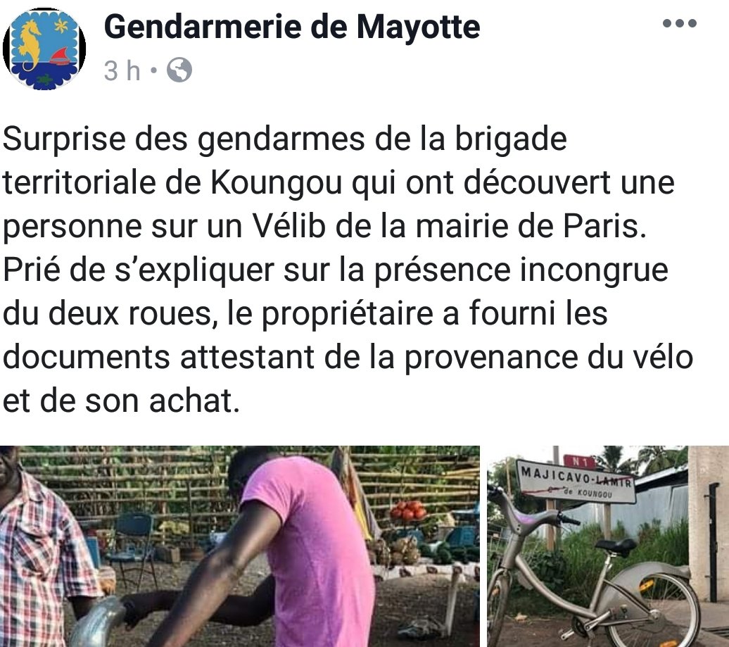 C’est la gendarmerie qui a trouvé un Vélib volé. C’est drôle d’histoire. Un Vélib de la ville de Pars se retrouve à Mayotte. Voilà les explications…