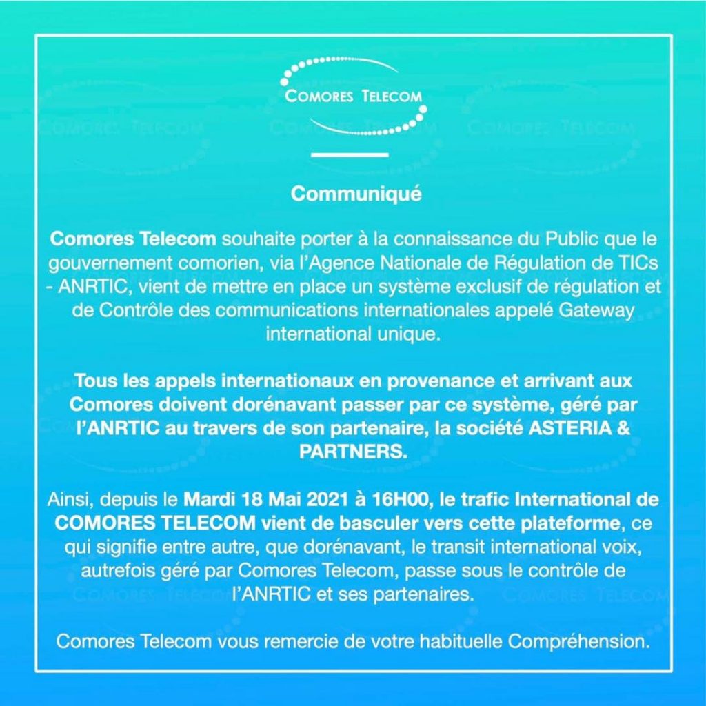 C’est fait. Depuis mardi 18 mai, les appels entrants et sortants des abonnés de Comores ne sont plus sous le contrôle de l’opérateur national mais d’une société étrangère au lourd passé judiciaire. En effet, le fleuron national de télécommunications vient d’annoncer au public que le gouvernement comorien, via l’Agence Nationale de Régulation de TICs – ANRTIC, vient de mettre en place un système exclusif de régulation et de Contrôle des communications internationales appelé Gateway international unique. C’est à dire que tous les appels internationaux en provenance et arrivant aux Comores doivent dorénavant passer par ce système, géré par l’ANRTIC au travers de son partenaire, la société ASTERIA & PARTNERS.