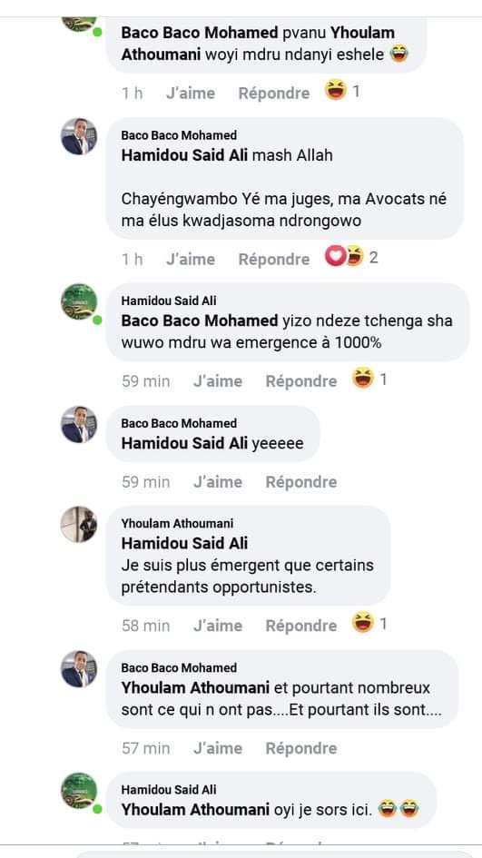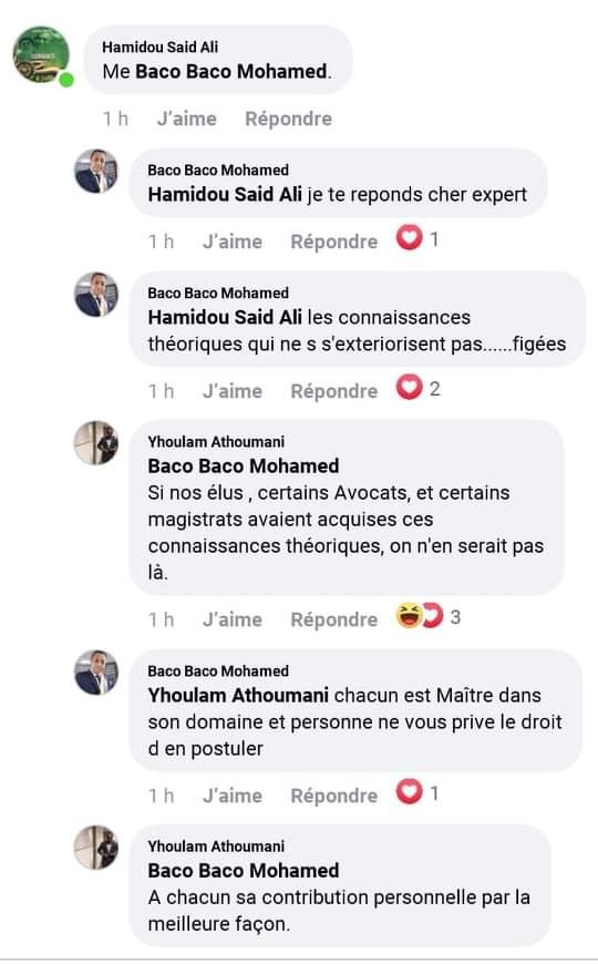 Hier, le juriste émergent Yhoulam a dénoncé la détention de l’ancien président Ahmed Abdallah Mohamed Sambi emprisonné depuis deux ans sans jugement. Selon lui, Sambi doit être libéré à défaut d’être jugé. Cela n’a pas plu Me Baco, ancien compagnon du parti Ridja, devenu accidentellement vice-président de l’assemblée nationale. Pour Baco a lancé une pique à Yhoulam : »les connaissances théoriques qui ne s’extériorisent pas…figée ».