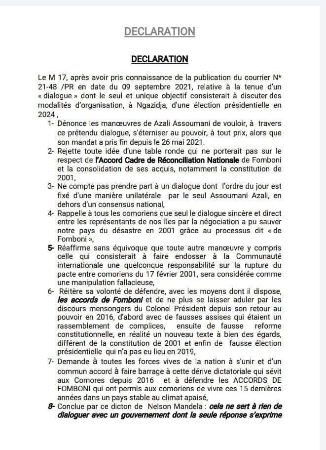 Déclaration du M17 à l’appel du Président Azali pour un dialogue national.