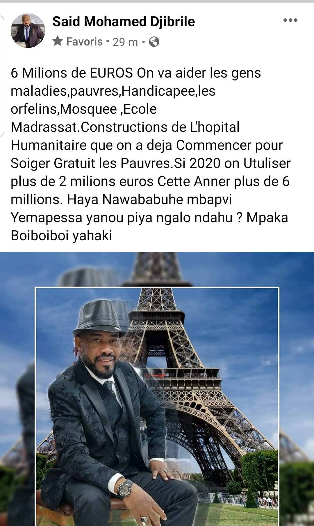 Le prédicateur Said Mohamed Djibrile annonce vouloir doubler le budget de dons qu’il aurait utilisé l’année dernière. Selon une publication faite hier soir sur sa page Facebook, il a dépensé 3 millions d’euros pour aider les personnes nécessiteuses.