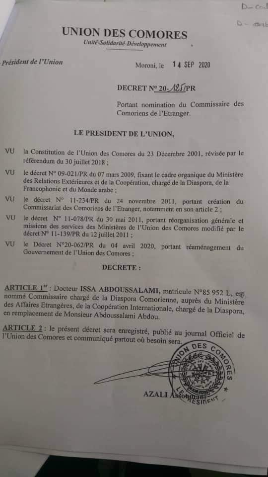 Le docteur Issa Abdoussalami, est nommé Commissaraire chargé de la Diaspora Comorienne, auprès du Ministère des affaires étrangères.