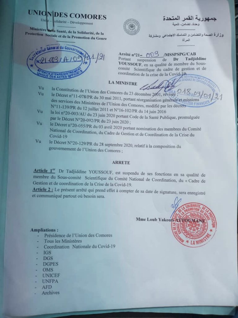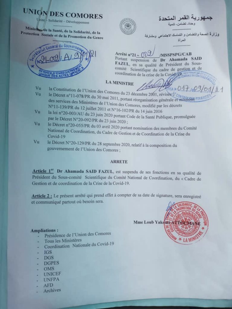 « Le directeur de cabinet du chef de l’État, le directeur de la police, et le directeur de la Sécurité civile sont identifiés comme des cas contacts et placés en isolement. Ils étaient dans le même vol que deux médecins testés positifs, au départ de Moheli pour Ngazidja vendredi en fin d’après-midi. Les deux médecins, dont le président du Comité scientifique chargé de la gestion de la crise de coronavirus, avaient caché leur positivité selon la ministre de la santé qui envisage des sanctions à leur encontre » avait écrit peu avant que la décision ne soit entérinée, le journaliste Toufé Maecha. Ci-dessous les deux arrêtés portant suspension des deux médecins indélicats