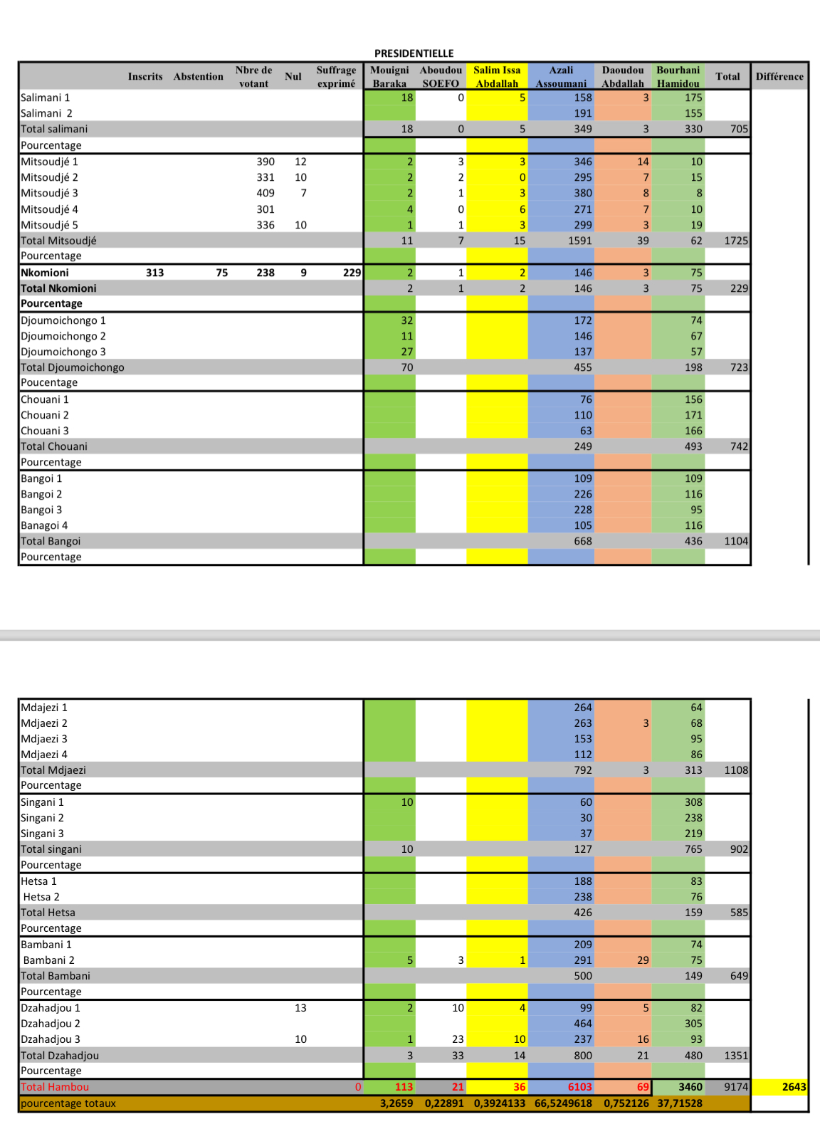 Flash info : Dans une journée marquée par l’effervescence électorale, la région de Hambou a exprimé sans équivoque sa volonté démocratique. Azali, le candidat porteur d’espoirs a conquis les cœurs avec une victoire éclatante, remportant un impressionnant 66% des suffrages. Face à lui, Bourhane, l’autre prétendant de la région de Hambou, a obtenu 27%, reflétant ainsi la diversité des opinions au sein de la population de Hambou qui est reconnaissante au président Azali. IBM