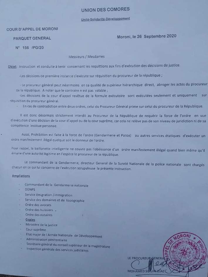 Les habitués du palais de justice de Moroni le savent: le procureur général et le procureur de Moroni sont en froid depuis des longs mois. S’ils ne se disputent pas au vu et au su des visiteurs, leur mésentente se lit sur les dossiers judiciaires sur lesquels, dans une course effrénée, chacun tente de mettre la main, dans un pays où le système judiciaire est réputé corrompu. Leur guerre prend des tournures inquiétantes car le procureur général vient de revendiquer sa supériorité de la manière la plus officielle, mais aussi brutale qui soit sur le procureur de la République. En effet, dans une note de service signée le 26 septembre, il a interdit au procureur de la République, connu pour faire la pluie et le beau temps au Palais, de saisir les forces de l’ordre dans les affaires relevant de la Cour d’appel, le potager du procureur général et du président de la même Cour. Signe, s’il le faut, de son profond mal-être, le procureur général rappelle qu’en sa qualité de « supérieur hiérarchique direct », il « peut abroger les actes du procureur de la République ». Comme si ce rappel ne suffisait pas, il insiste à dire que « le contraire n’est pas valable ». À bon entendeur, salut.