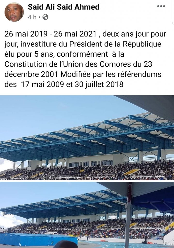 Enfariné à l’aéroport de Roissy, Said ali n’avait pas pris la parole sur les réseaux sociaux. Mais ce 26 mai, il a tenu à rappeler à l’opposition que Azali est bien président et il est élu pour 5 ans. Il fait un clin d’oeil et une piqûre de rappel au Daoula ya haki…