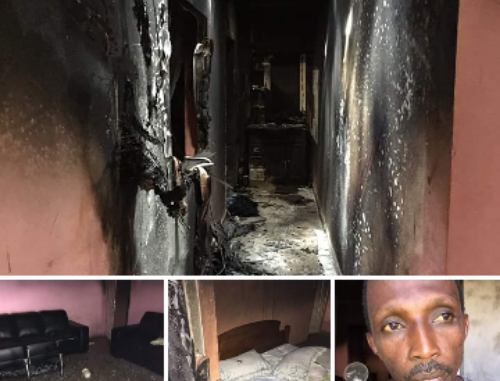 Les individus n’arrivant pas à accéder à la salle de bains fermée à clé, ont annoncé qu’ils allaient mettre le feu pour qu’ils meurent étouffer et ils ont mis leurs menaces à exécution. Le feu s’est propagé dans la maison et la fumée commençait à asphyxié la femme d’Abdou qui a dû casser une canalisation d’eau dans la salle de bains pour imbiber une serviette d’eau et la poser sur le visage de sa femme. La Police est intervenue mettant en fuite les individus.