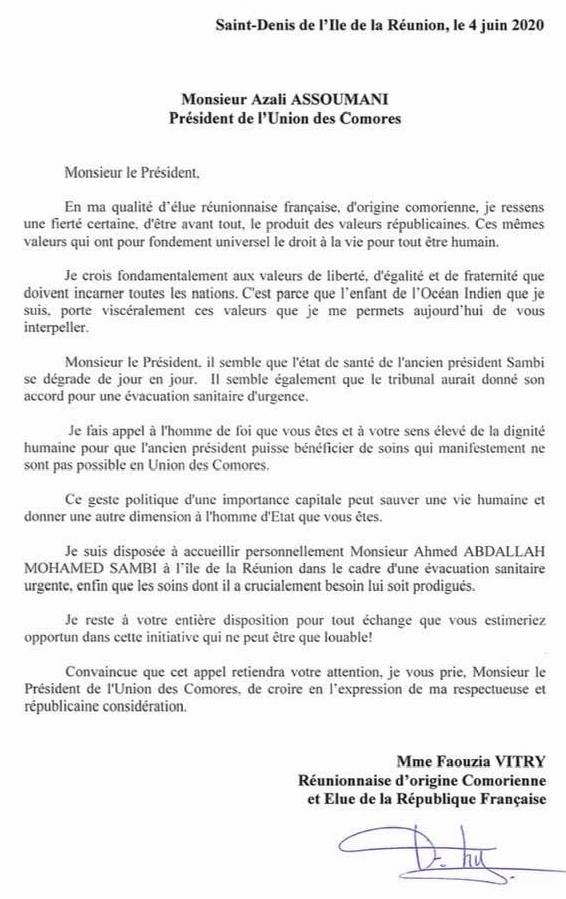 Faouzia Vitry, une élue française originaire des Comores interpelle le président Azali sur l’affaire Sambi.