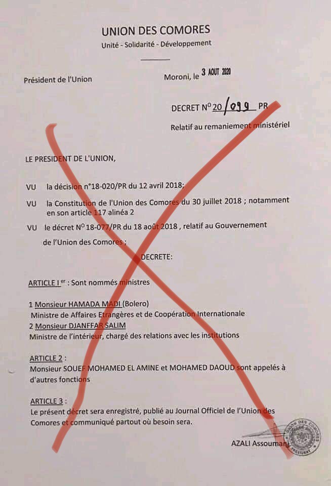 Circule sur internet un document faisant croire que l’ancien secrétaire général de la COI, Hamada Bolero, est nommé ministre des affaires étrangères après la démission d’El-amine Souef. Ce « décret » est un canular. Un faux. Azali Assoumani n’a pas encore nommé un nouveau chef de la diplomatie. Du moins jusqu’à 15H de ce lundi 3 août. Ce n’est pas la première fois qu’un document faussement attribué au chef de l’État circule.