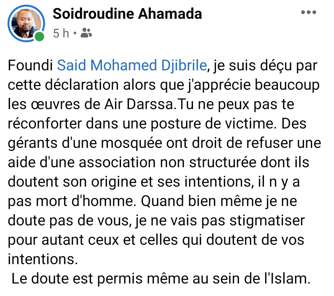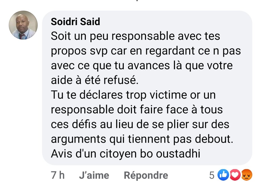 Foundhi Djibril est en colère et pointe du doigt les responsables de la mosquée. Il a voulu aider la mosquée de Moroni mais les responsables ont refusé. Oui ils ont le droit de refuser l’aide venant d’ailleurs. Mais foundhi Djibril se victimise en invoquant ses origines villageoises. Est il vraiment responsable ? Pourquoi veut il forcer les gens accepter son aide ?